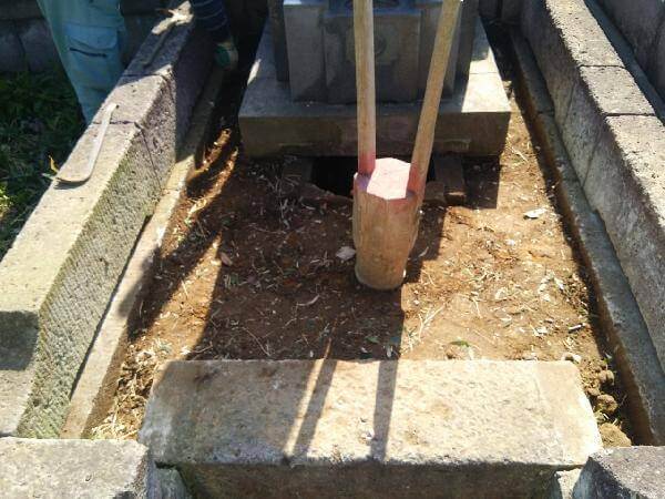 墓石横の狭い箇所は手作業で少しずつ進めるしかありません。